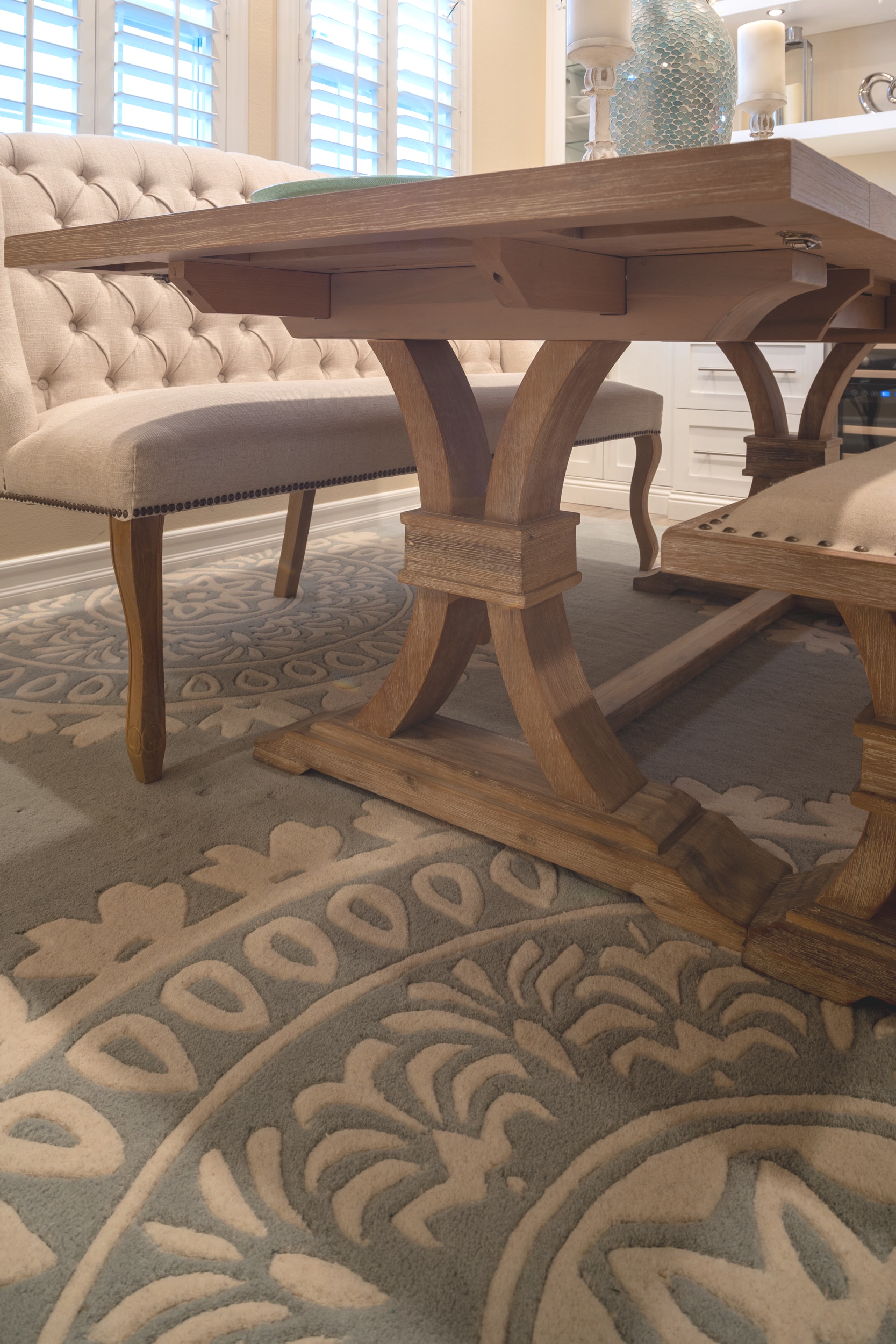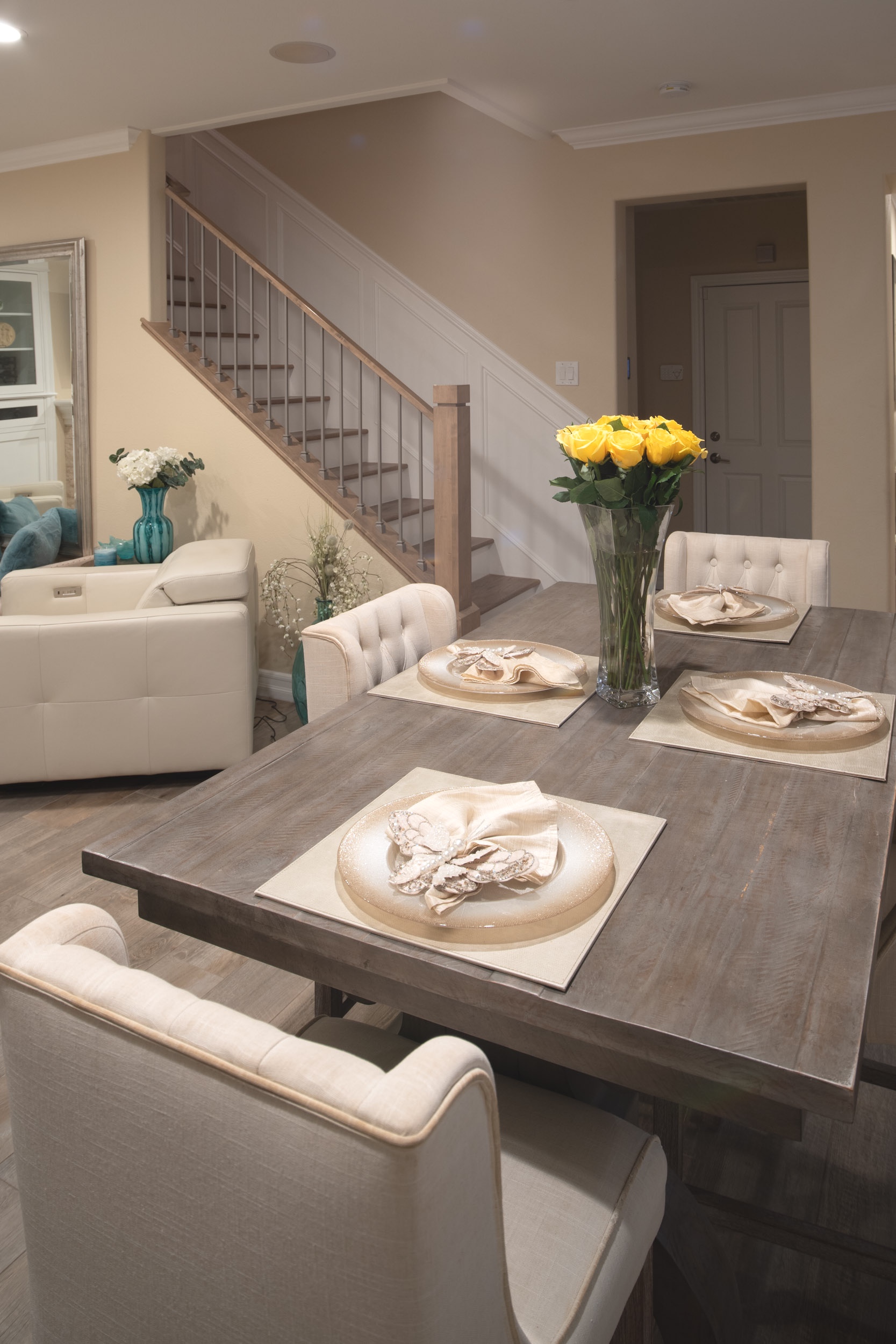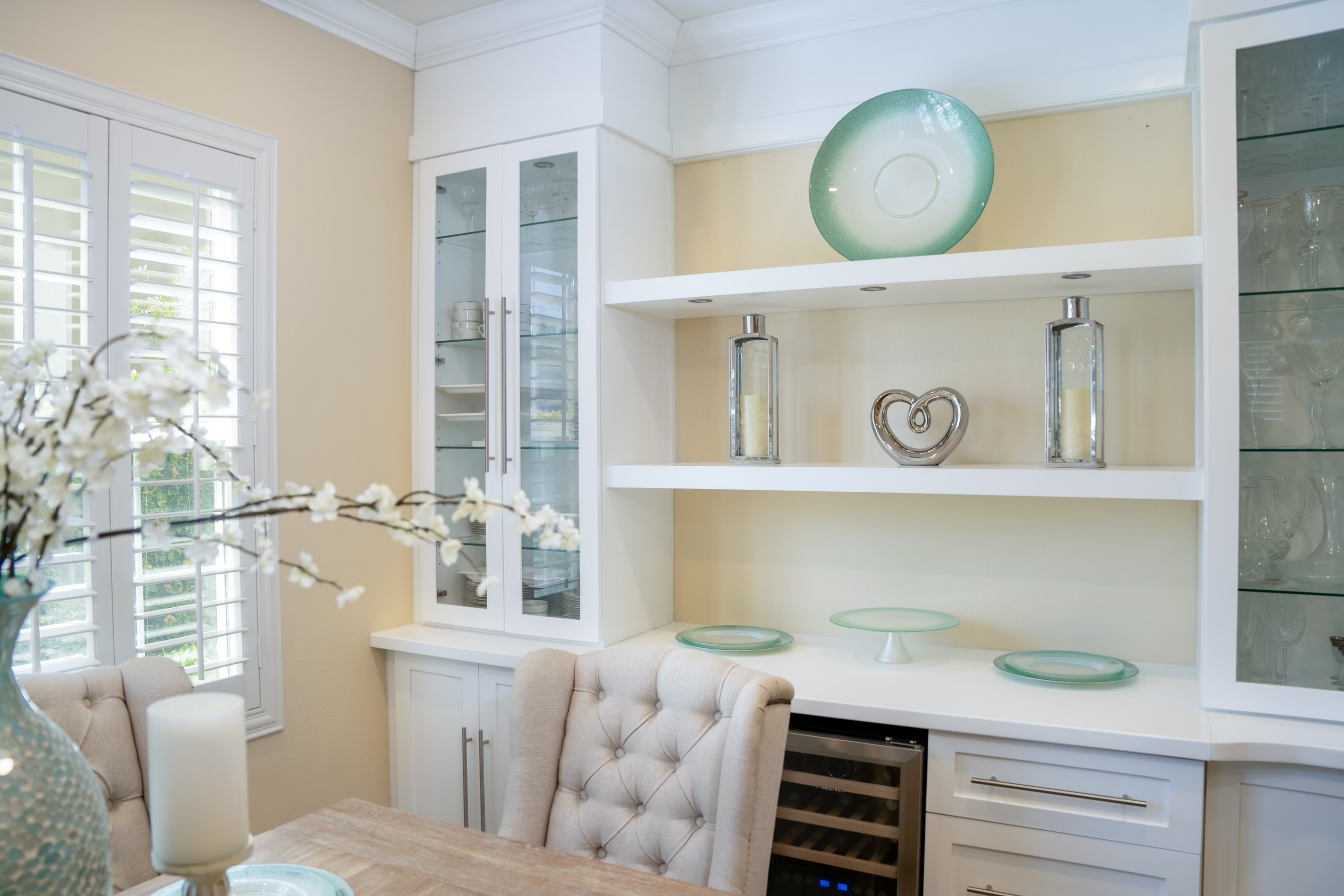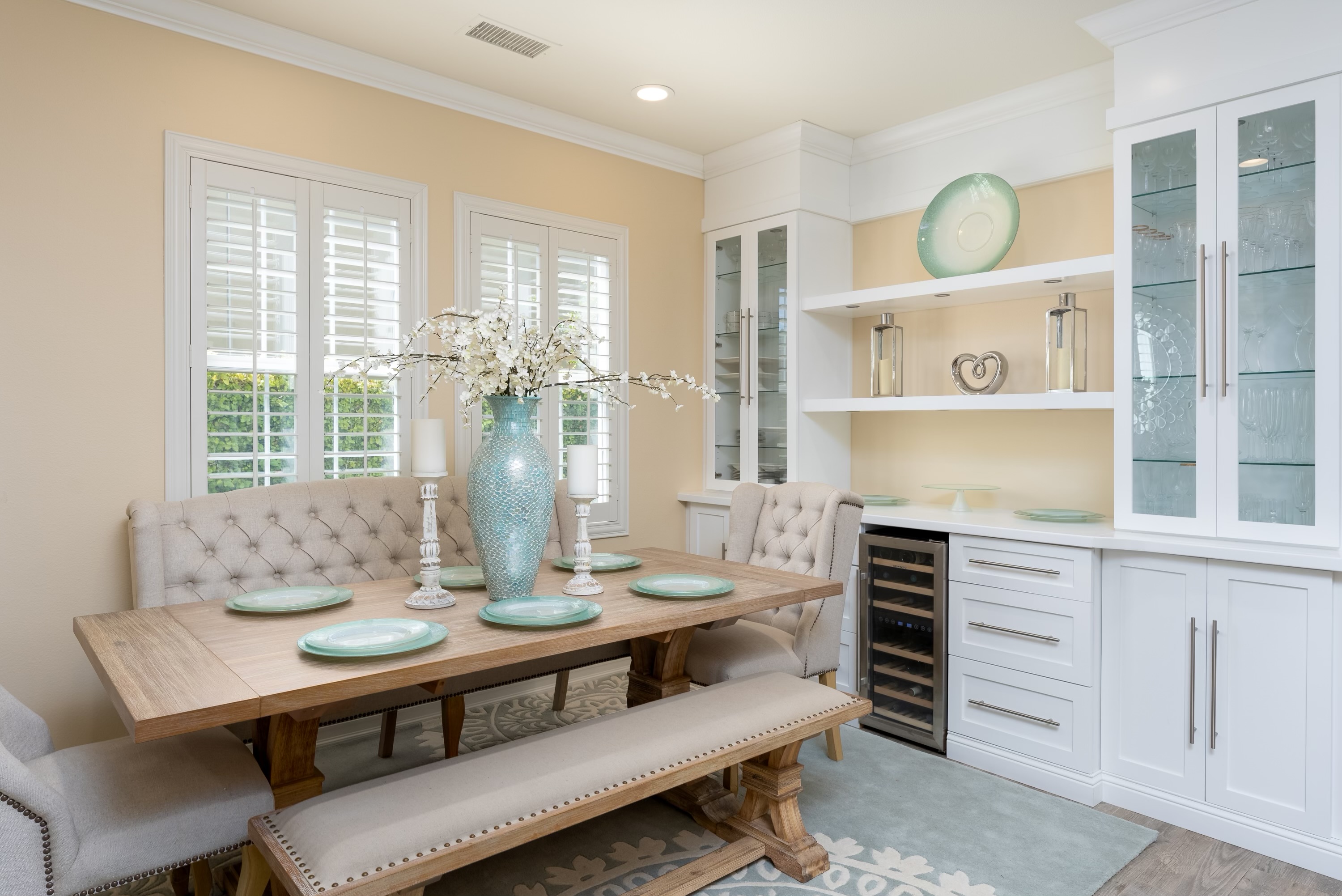 The design concept of transitional elegance combines classic and contemporary elements to achieve a timeless and sophisticated aesthetic. White cabinetry provides a clean and versatile backdrop, complemented by soft yellow walls that add warmth and cheerfulness. A splash of soft blues as an accent color throughout the space introduces visual interest and depth, evoking a sense of calmness and serenity while enhancing the overall harmony and balance of the design. A perfect environment for any occasion.
